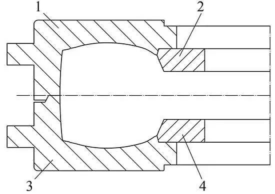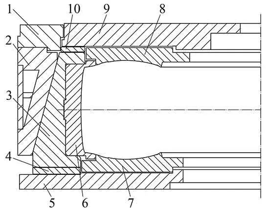 工業(yè)輪胎模具導(dǎo)向機(jī)構(gòu)的導(dǎo)向面為圓錐面的稱為圓錐面式活絡(luò)模具,與斜平面相比,圓錐面有良好的可加工性,普通的機(jī)床可滿足精度要求。圓錐面式模具的裝配精度要求較低,模具零件磨損后,周向偏差能夠自動(dòng)補(bǔ)償,對(duì)硫化輪胎圓度影響小,對(duì)輪胎的膠邊和錯(cuò)花問(wèn)題影響也不明顯。但是模具開合過(guò)程中,弓形座和中模套上的耐磨板由線接觸逐漸過(guò)渡到圓錐面接觸,造成耐磨板不均勻磨損、模具動(dòng)作不平穩(wěn)以及對(duì)硫化機(jī)的適應(yīng)性低。